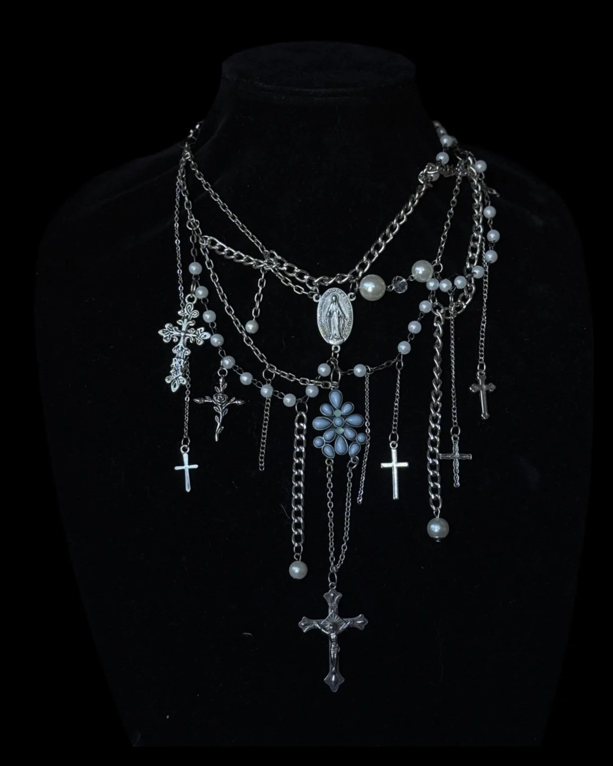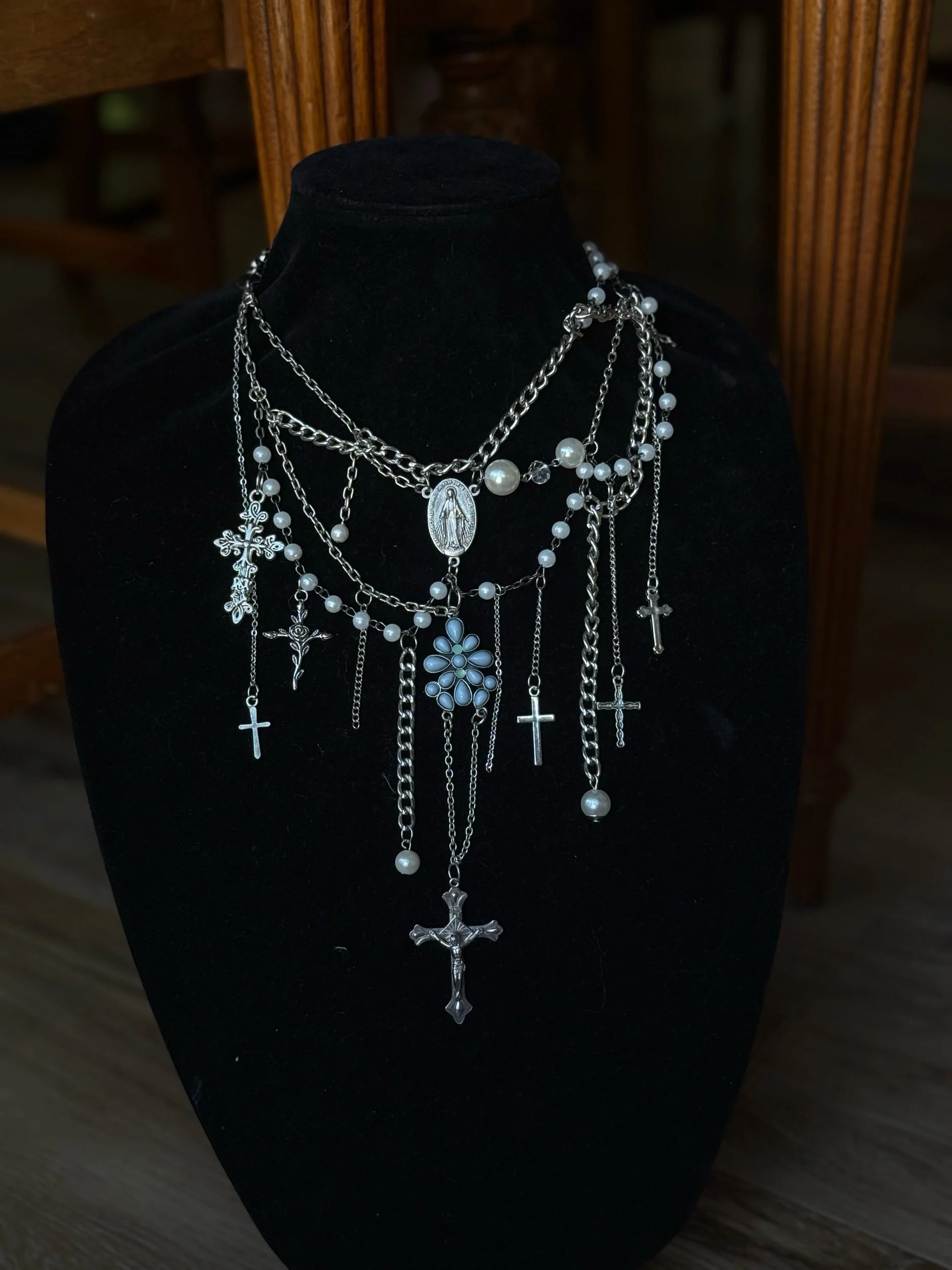 Upcycled layered religious iconography necklace. Crafted with repurposed silver chain & found objects