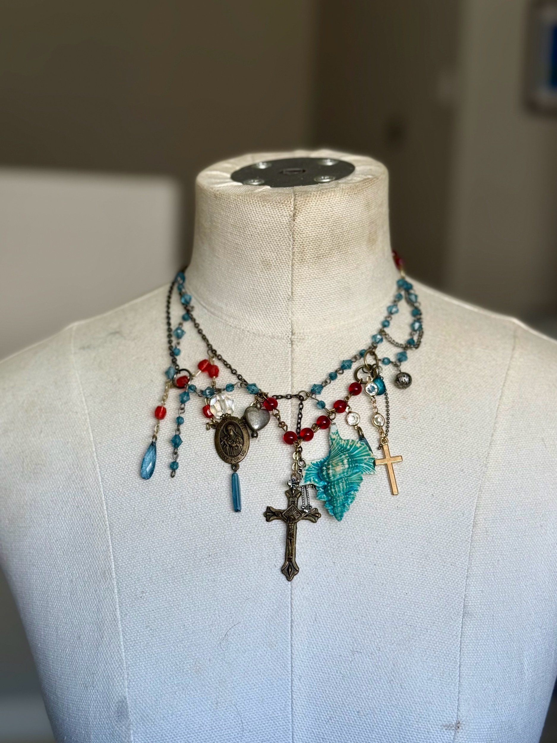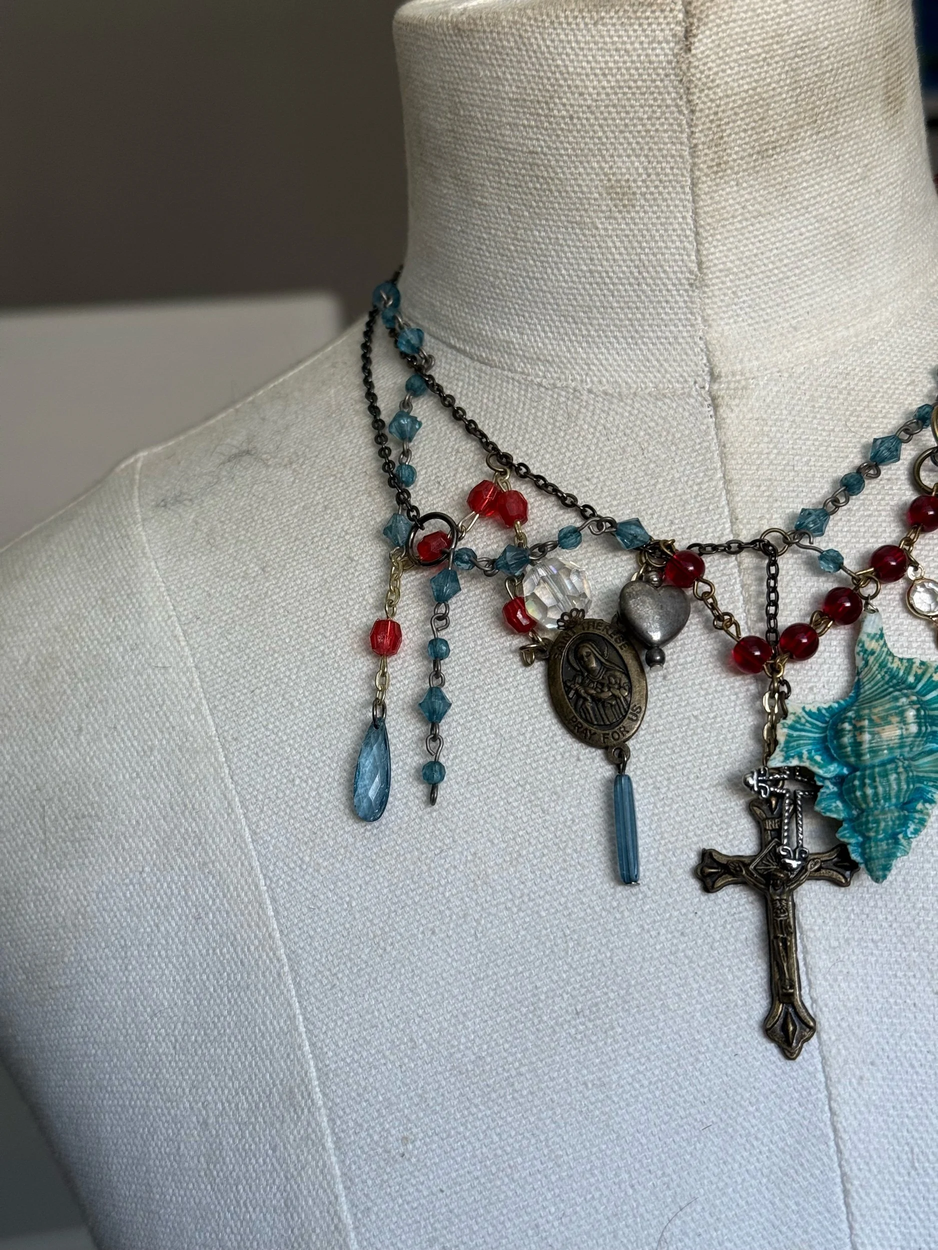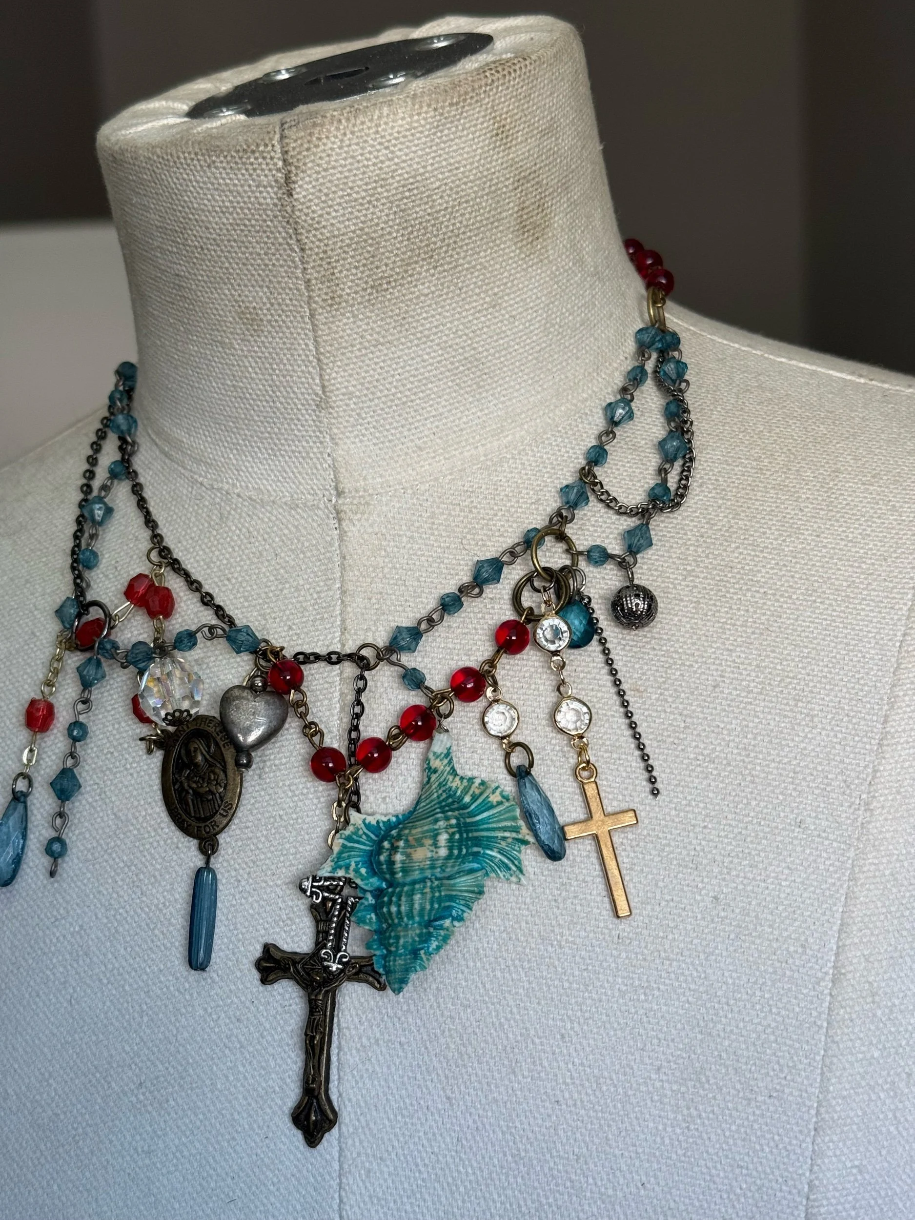 Stunning upcycled maximalist mermaid necklace adorned with religious cameos, shells & other found objects