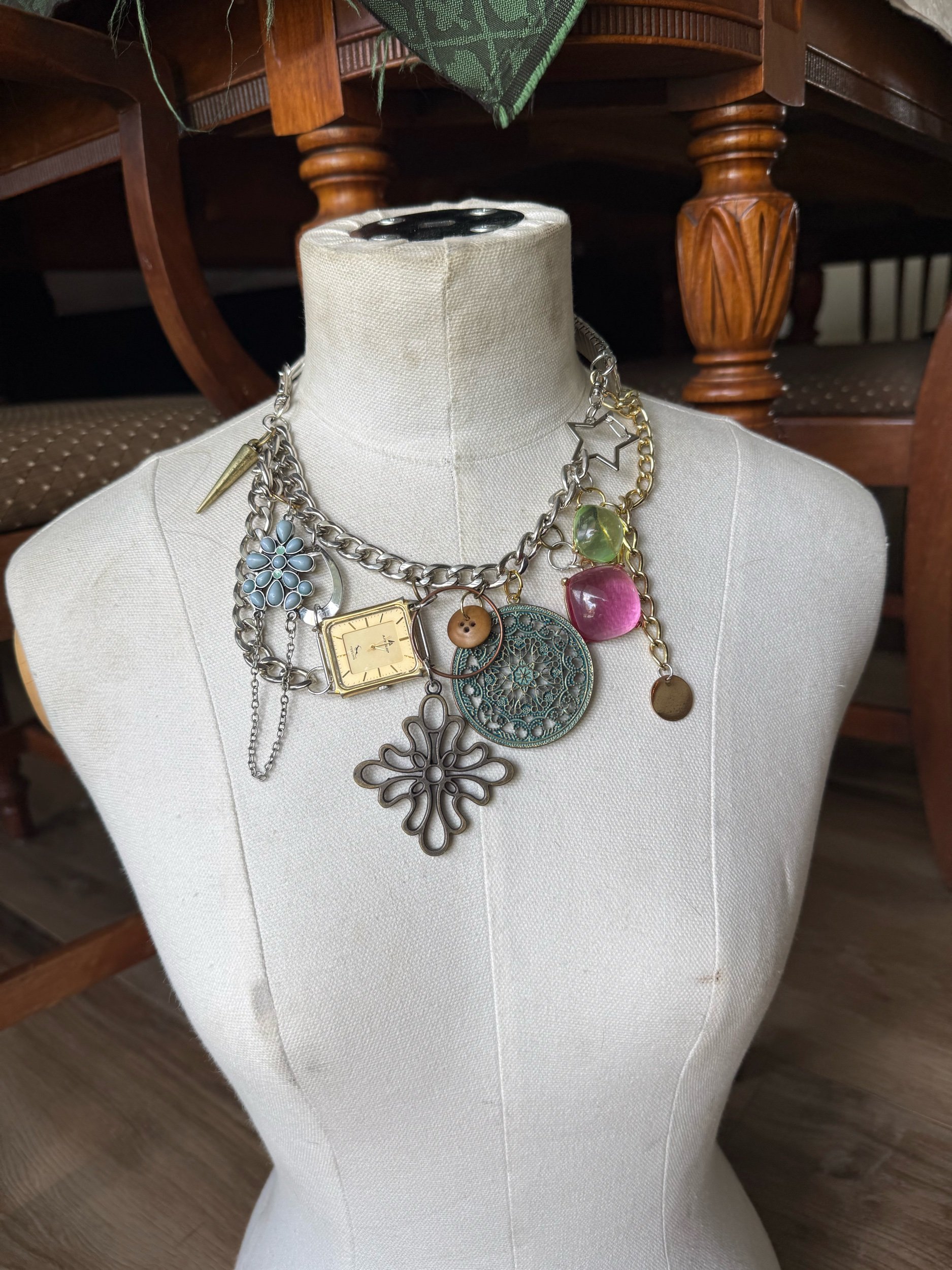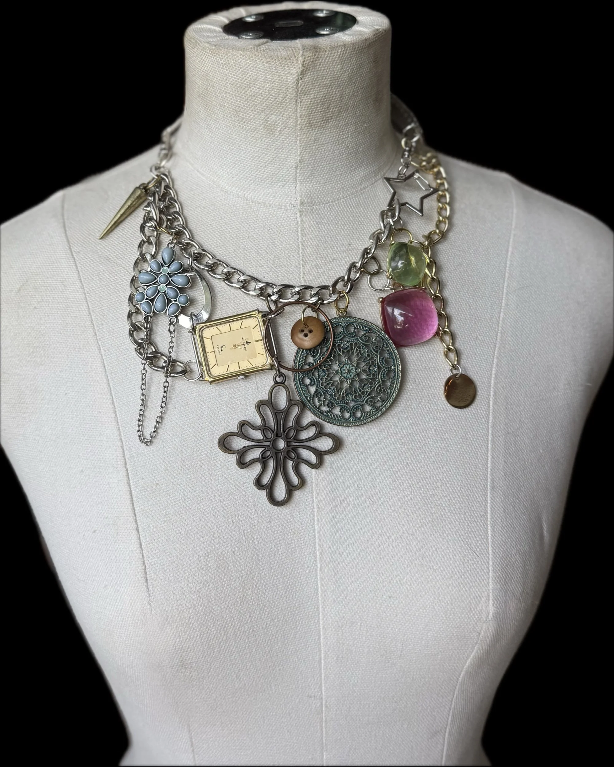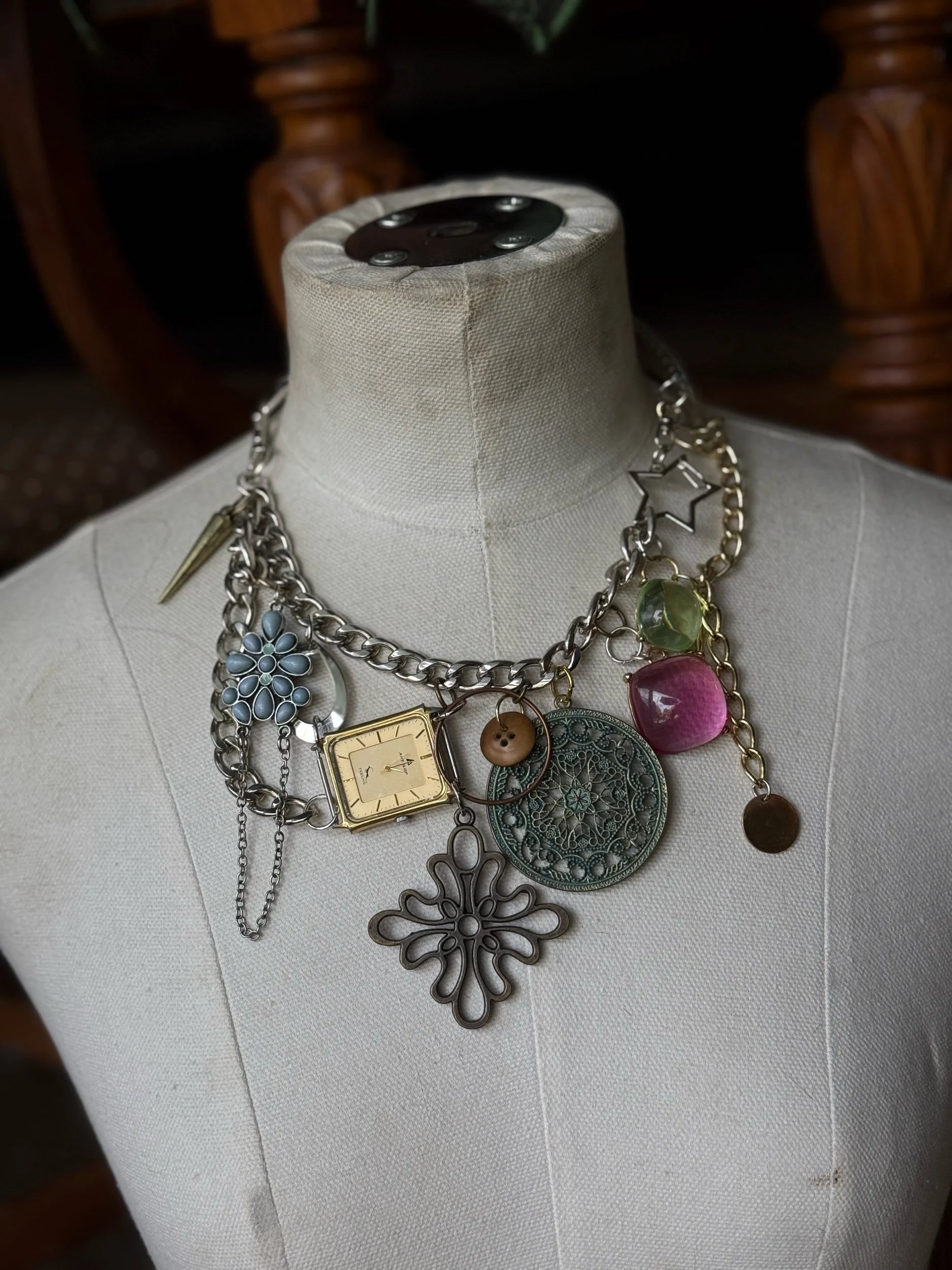 Upcycled clutter core choker adorned with found objects. Vintage stretch watch band in the back for the ultimate comfort