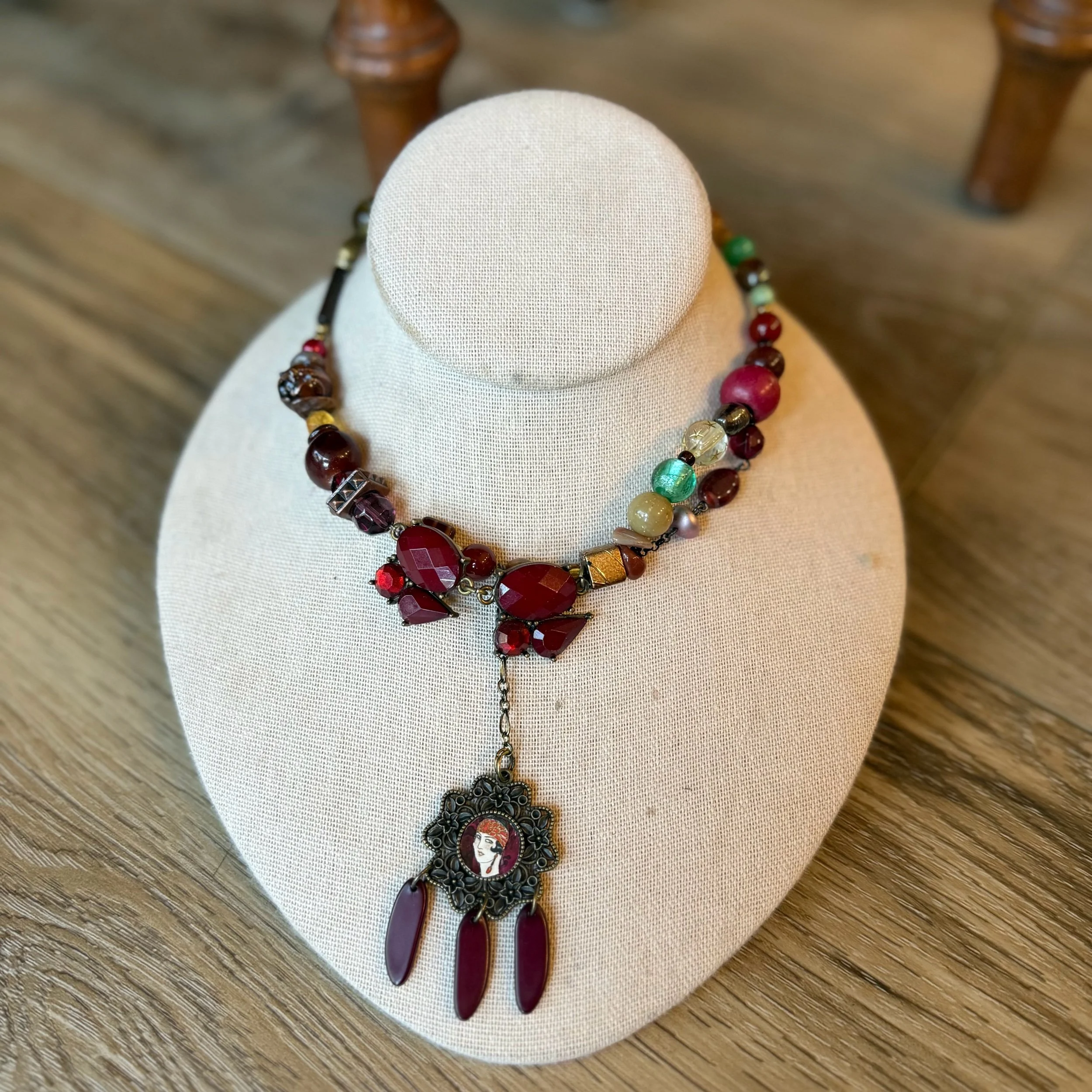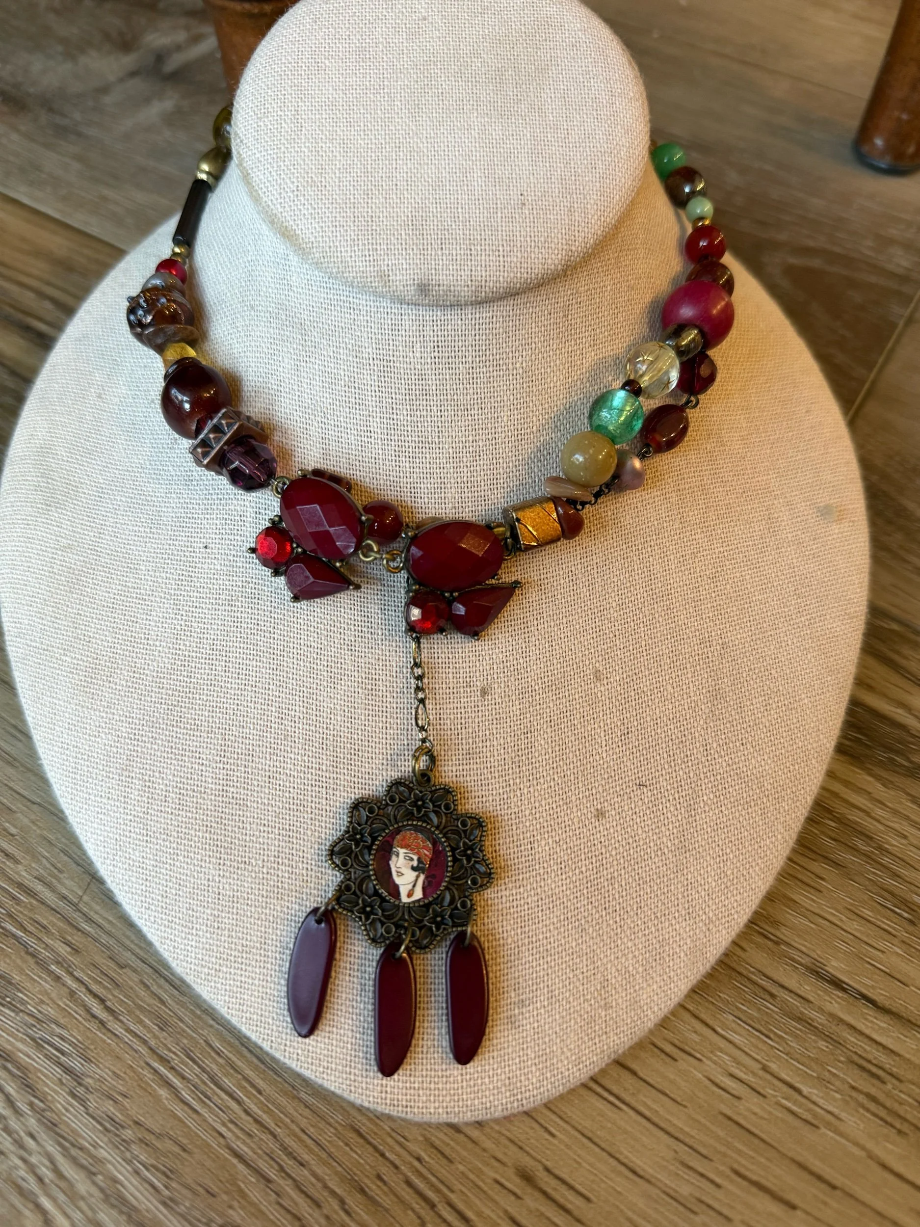 Hybrid choker/necklace adorned with a cute flapper girl. Crafted with vintage beads n found objects