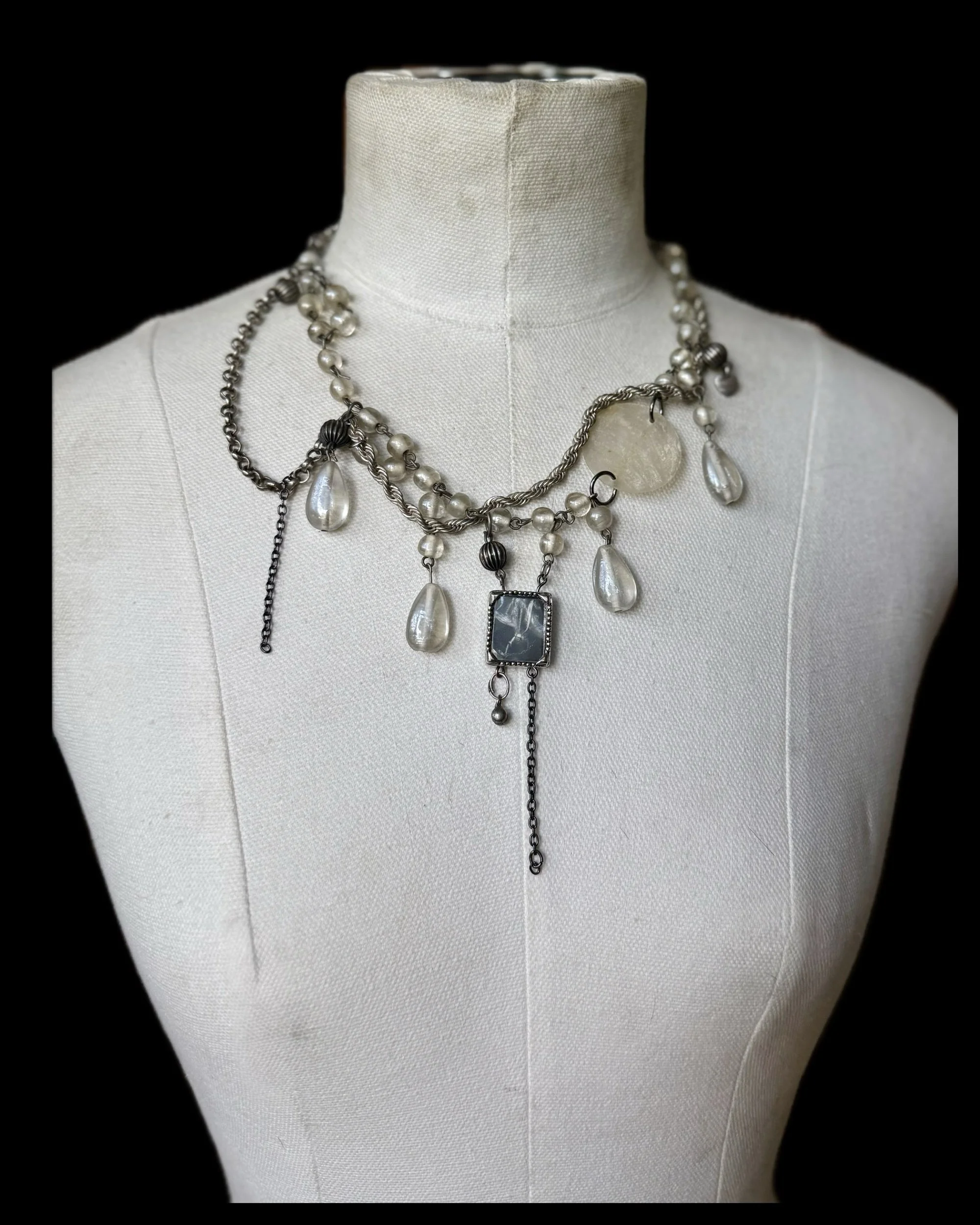 Upcycled Byzantine empire inspired necklace adorned with crystal clear glass beads, a cameo portrait & more